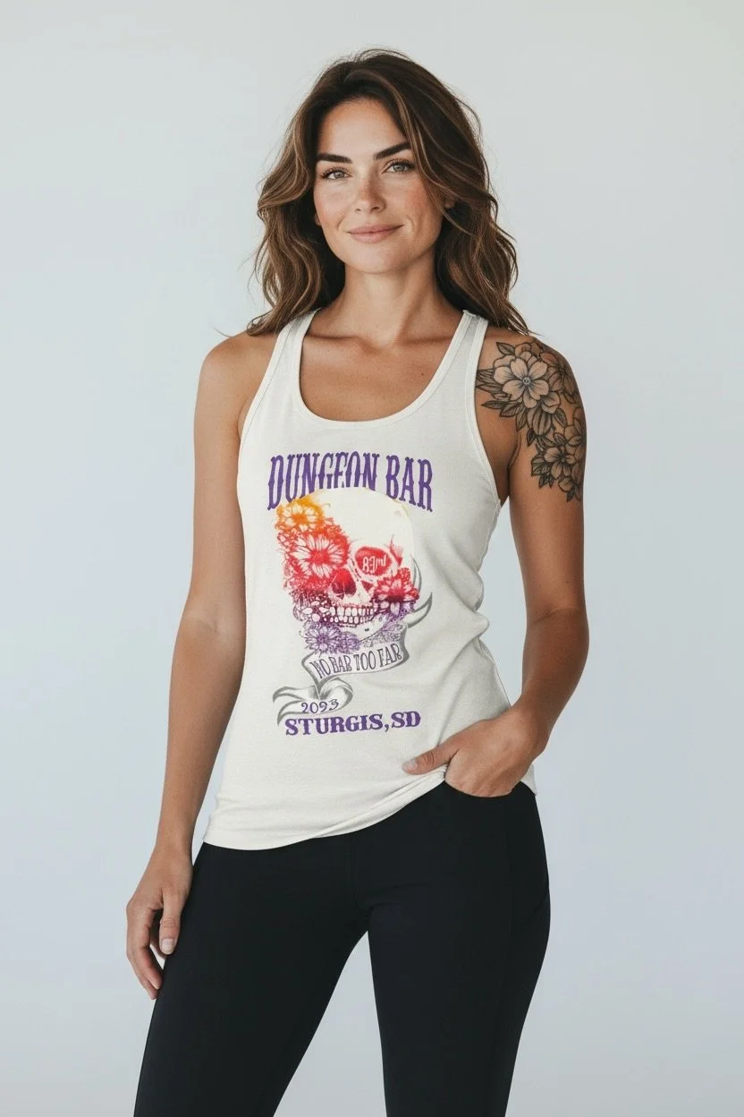 Official 2023 Dungeon Bar tank featuring the floral skull “No Bar Too Far” design. A Sturgis, SD classic and a staple piece of Dungeon Bar merch. Perfect for Rally season or everyday wear.