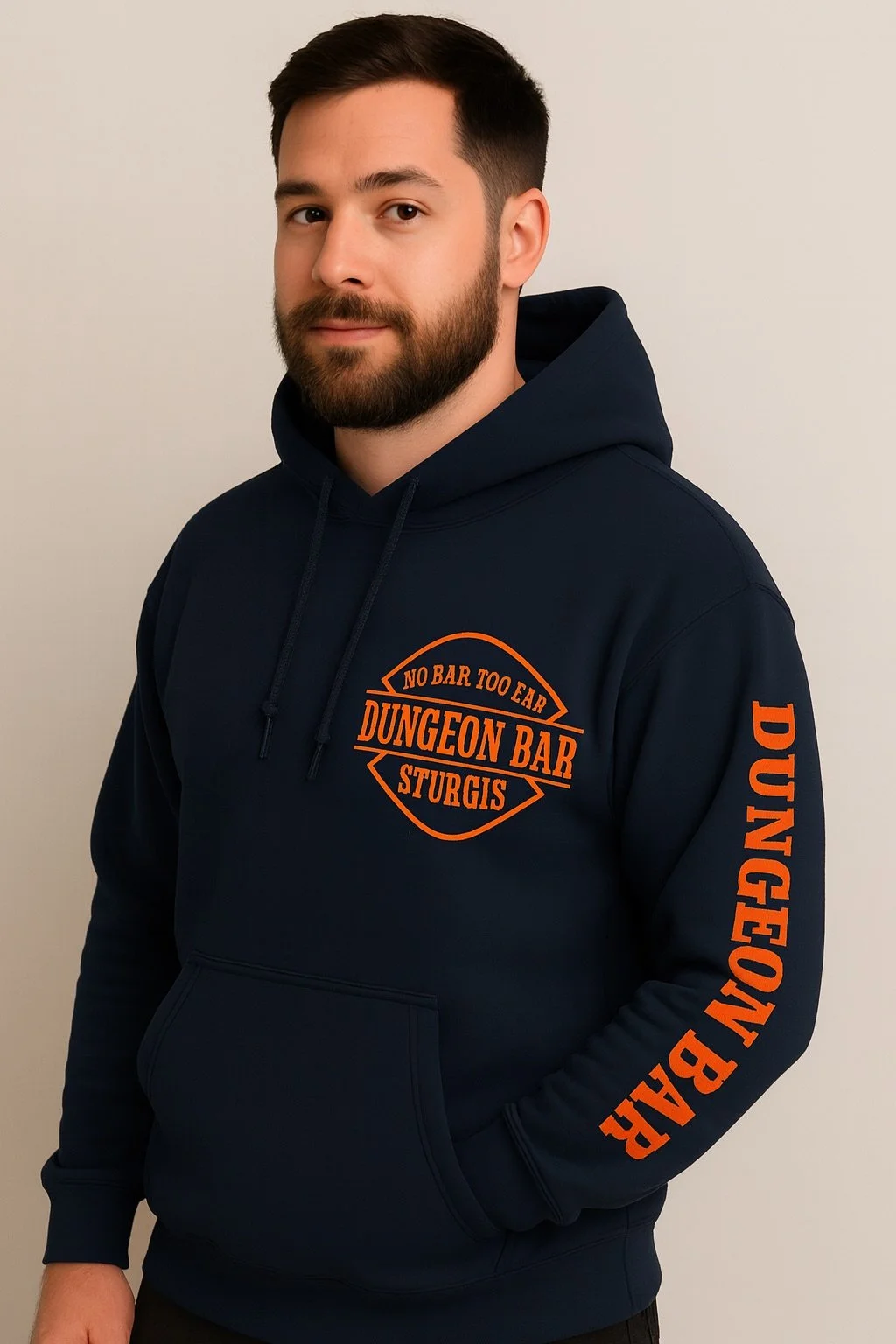 Your new favorite hoodie. Soft, warm, and printed with the bold Dungeon Bar Sturgis logo in vivid orange print. Perfect for Rally season, cold rides, or showing love for the oldest biker bar in Sturgis.