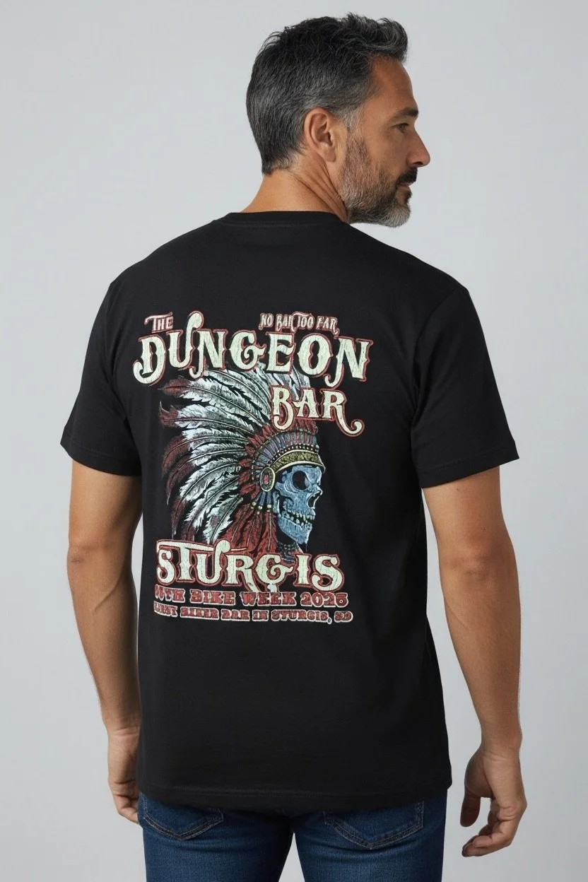 The classic Dungeon Bar rally design, now on a sleek black T-shirt. Featuring the clean front pocket logo and bold full back graphic with the iconic skull headdress. A must-have piece for anyone repping Sturgis’ oldest biker bar.